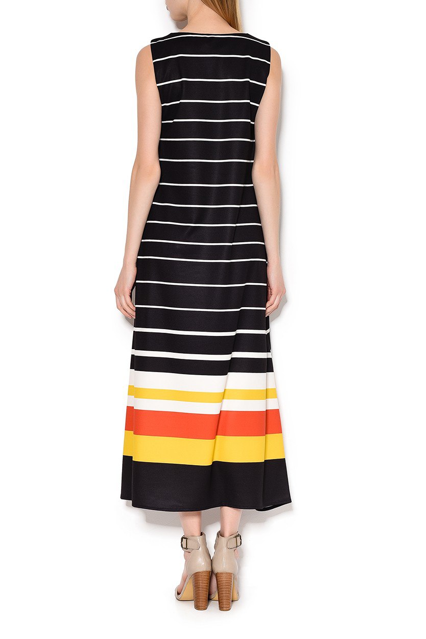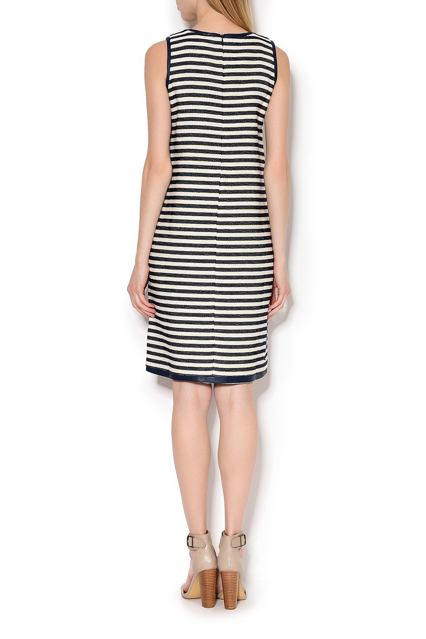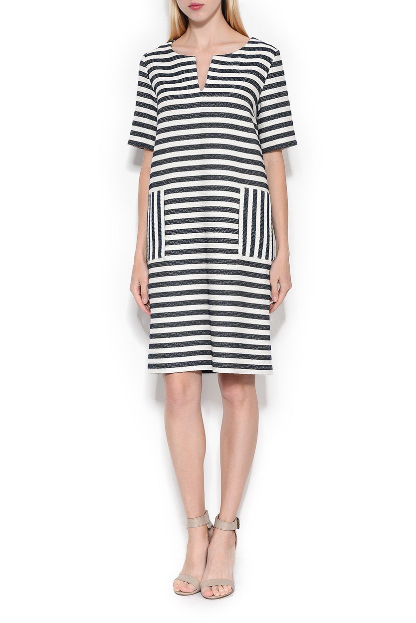 Изящное платье, закрывающее ключицы, подойдет стройным девушкам. Интересной отличительной особенностью этой модели является отделка кантом из эко-кожи по пройме рукава, горловине и низу изделия. Фасон платья прямой, поэтому его могут выбрать женщины с прямоугольным типом фигуры.3. Платье Surri в контрастную полоскуЭтой весной главной характеристикой полоски будет неоднородность: на подиумах она была вертикальной, горизонтальной, монохромной или цветной, а иногда даже с эффектом оптической иллюзии. Такое исполнение вполне может заинтересовать женщин, которые не могут остановиться на чем-то одном и любят экспериментировать с образами.