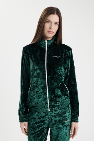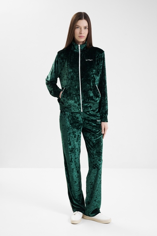 Женские брюки MC2 Saint Barth в темно-зеленом цвете (CHENILLE SB 51 EMB) выполнены из велюрового материала. Состав: 90% полиэстер, 10% эластан. Высокая посадка и эластичный пояс на резинке обеспечивают мягкую фиксацию, прямой крой с декоративными лампасами визуально вытягивает силуэт. Страна бренда Италия. Сочетаются с жакетом коллекции.